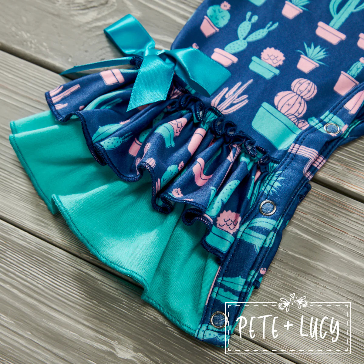 Navy blue and turquoise pair perfectly with this cute cactus print. ruffle ankles and bow accent.