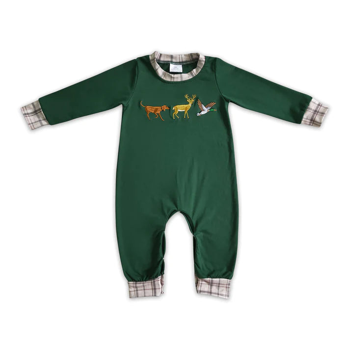 Boys Bestfriends Hunter Green Romper - Dog, Deer & Duck
