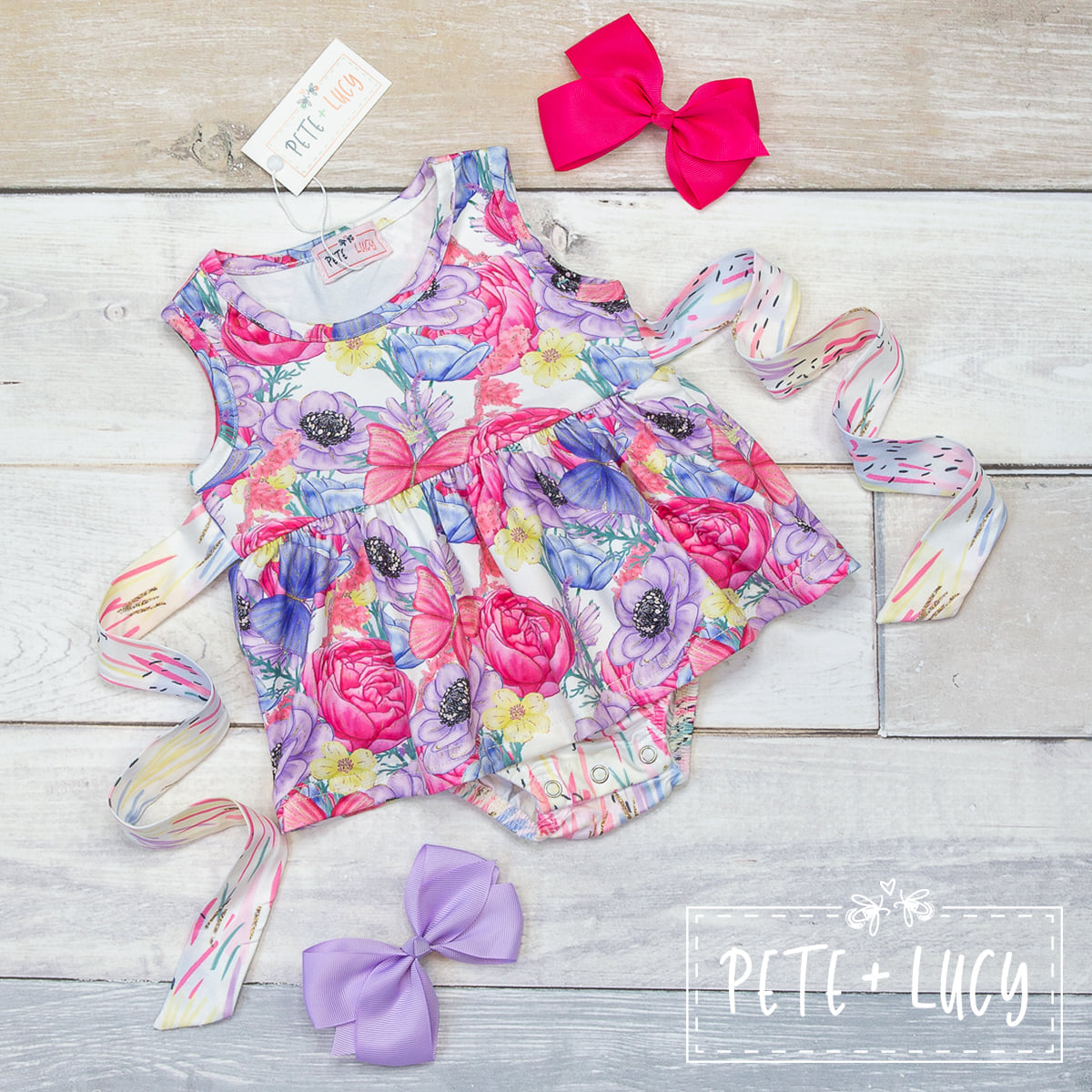 Colorful roses with striped tie in the back. Sleeveless romper.