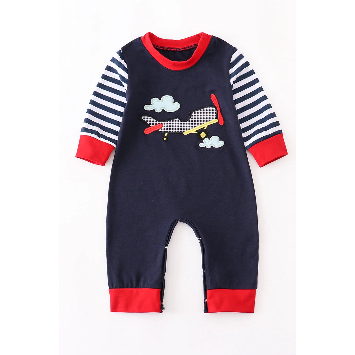 Navy boys romper with white stripe sleeves and red accents. Fly away in this adorable embroidered airplane on the front