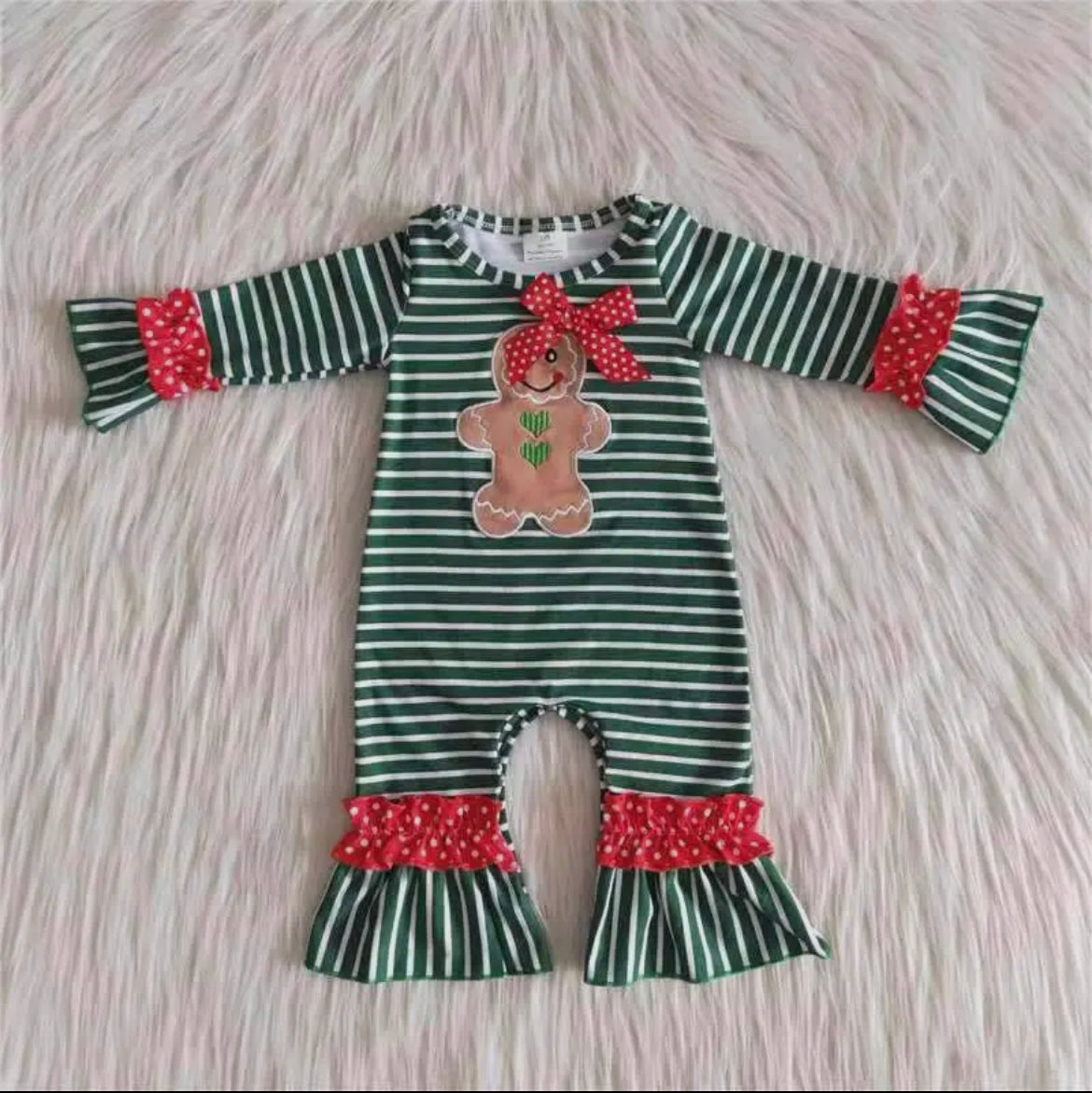 Green and white stripe girls romper with gingerbread man in front and red bows
