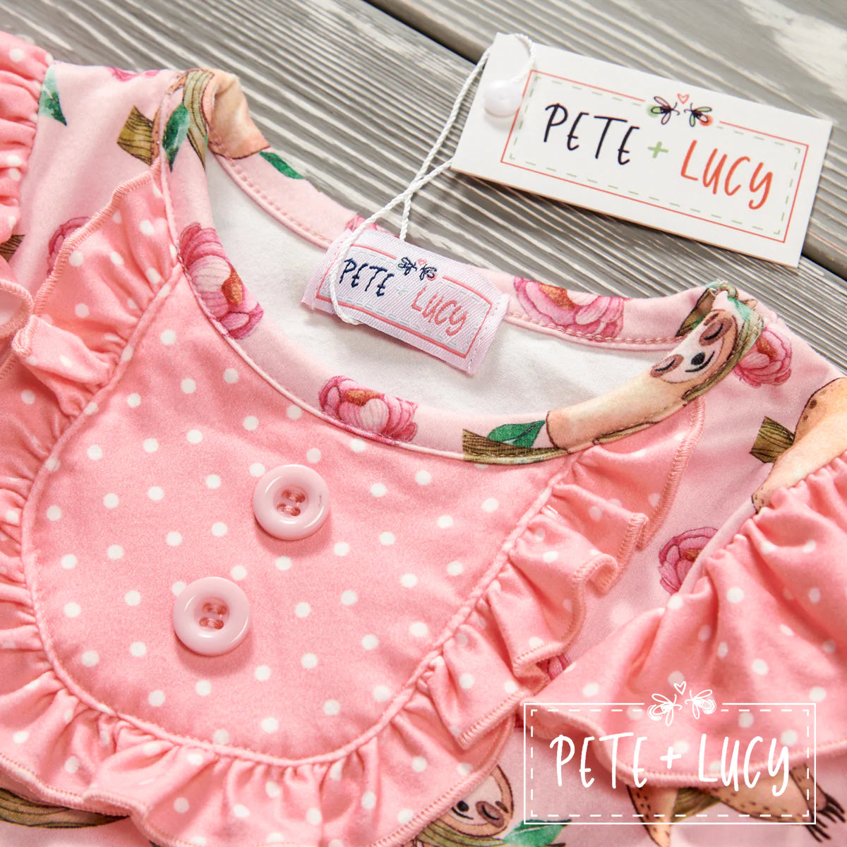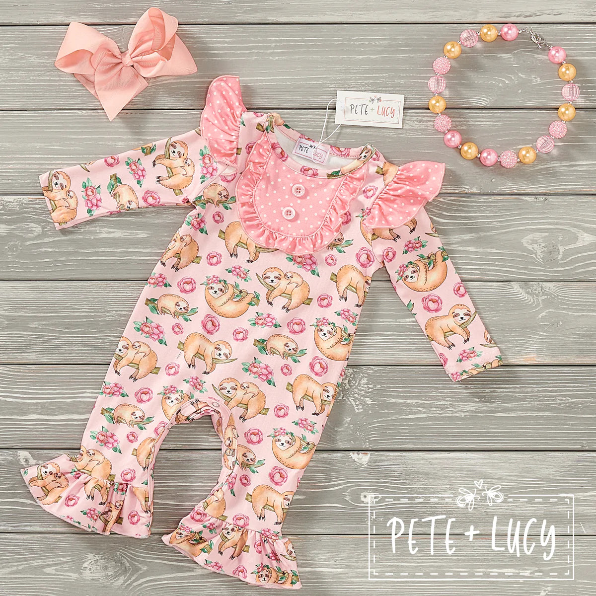 Pale pink background is perfect for the love of sloths that take over this outfit. With ruffle accents at neck and ankles, there will be no doubt in her love of sloths.