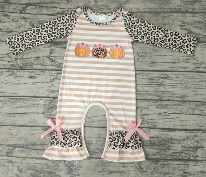 Leopard print long sleeves with stipes on bodice and embroidered pumpkins. Leopard print ruffles and pink bow on ankles.