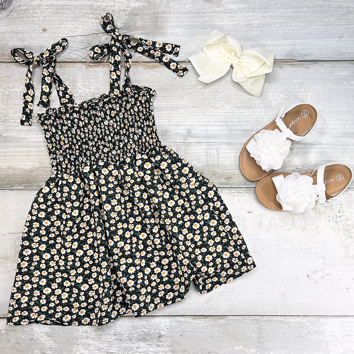 Black makes the perfect backdrop for these dainty sunflowers on this girls sundress. Ties on the shoulders make for a perfect fit.