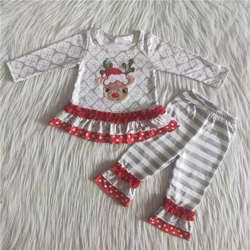 White & Gray stripe pants set with red accents and embroidered reindeer.